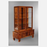 deutsch 1930er Jahre, auf der Rückwand bezeichnet "Rosenthal No. 16", in kaukasischem Nussbaum furniert, facettgeschliffene Glasscheiben, innen drei Einlegeböden aus Glas, Tür mit Stangenschlos, Alters- und Gebrauchsspuren, Maße 169 x 120 x 44 cm.