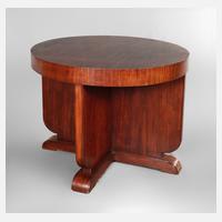 deutsch 1930er Jahre, in indischem Palisander furniert, runde Platte auf kreuzförmigem Gestell, profilierte Kanten mit abgerundeten Ecken, guter Zustand, H 75 cm, D 100 cm..