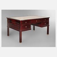 mahagonifurniert, sehr tiefer, frei im Raum stellbarer Schreibtisch, allseitig kassettiert, auf Vierkantfüßen mit verchromten Messingmanschetten, schlichte verchromte Beschläge, restauriert, Lederbespannung der Schreibplatte fehlt, etwas rest.bed., Maße 80 x 162 x 99 cm.