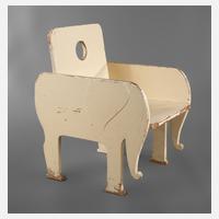 um 1920, Schichtholz und Nadelholz in originaler beiger Farbfassung, die beiden Seitenteile in Form eines stilisierten Elefanten ausgesägt, dazwischen schräg eingestellte Lehne mit kreisrunder Öffnung, unrestaurierter Originalzustand, Maße 76 x 54 x 61 cm.