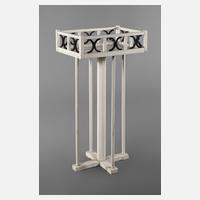 wohl Wien 1920er Jahre, rundes Gestell aus massiver Birke, dunkelbraun gebeizt, eingelegte Platte aus Messingblech, fein getriebenes stilisiertes Floraldekor, guter Originalzustand, H 58 cm, D 67 cm.