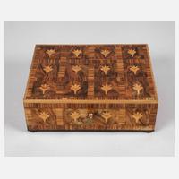 um 1920, flacher rechteckiger Korpus in Nussbaumwurzel, Zebrano und Ahorn furniert, die Wandung umlaufend von geometrischen Feldern mit rapportierendem Blütendekor verziert, innen mahagonifurniert sowie teils mit blauem Samt ausgekleidet, mit Schlüssel, leichte Altersspuren, Maße 9 x 26 x 20 cm.