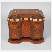 um 1920, handschriftlicher Besitzername G. Cristal, polygonal facettierter Korpus, überaus aufwendig in Nussbaumwurzel und-maser, Vogelaugenahorn, Birke, Mahagoni und Perlmutt intarsiert, die Front mit Eckrisaliten, die Wandung umlaufend von Gitterwerk und Schachbrettmustern verziert, der schwere scharnierte Deckel dieser in korrespondierendem Dekor sowie eingelegten Rauten, Messingmontierungen, dreigeteiltes Innenleben, originaler Schlüssel, Altersspuren und minimalste Furnierverluste, Maße 29 x 26 x 35 cm.