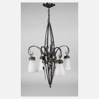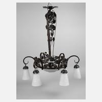 Frankreich, 1930er Jahre, sign. Muller Freres Luneville, brüniertes schmiedeeisernes Gestell, verziert von plastischen Rosenranken, mittig abgehängter Ring, welcher sechs spiralförmige Lampenarme trägt, daran abgehängte Glockenschirme sowie zentral eingelassene Schale aus satiniertem, im Model formgeblasenem Klarglas mit stilisiertem Floraldekor, insgesamt siebenflammig elektrifiziert, min. Altersspuren, H ca. 90 cm, D ca. 70 cm.