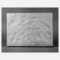 1964 aus einer limitierten Edition von 45 Stück, grüne Stempelmarke mit Schriftzug "Germany, rechteckige Wandplatte aus Biskuitporzellan mit strukturierter Oberfläche und unregelmäßigen Vertiefungen, beigegeben Ausstellungsbroschüre "Dokumenta Foundation Galerie Pels-Leusden, Villa Griesebach 1992", im Holzkarton, guter unbeschädigter Zustand, H 36,5 x B 49 x T 3,5 cm.