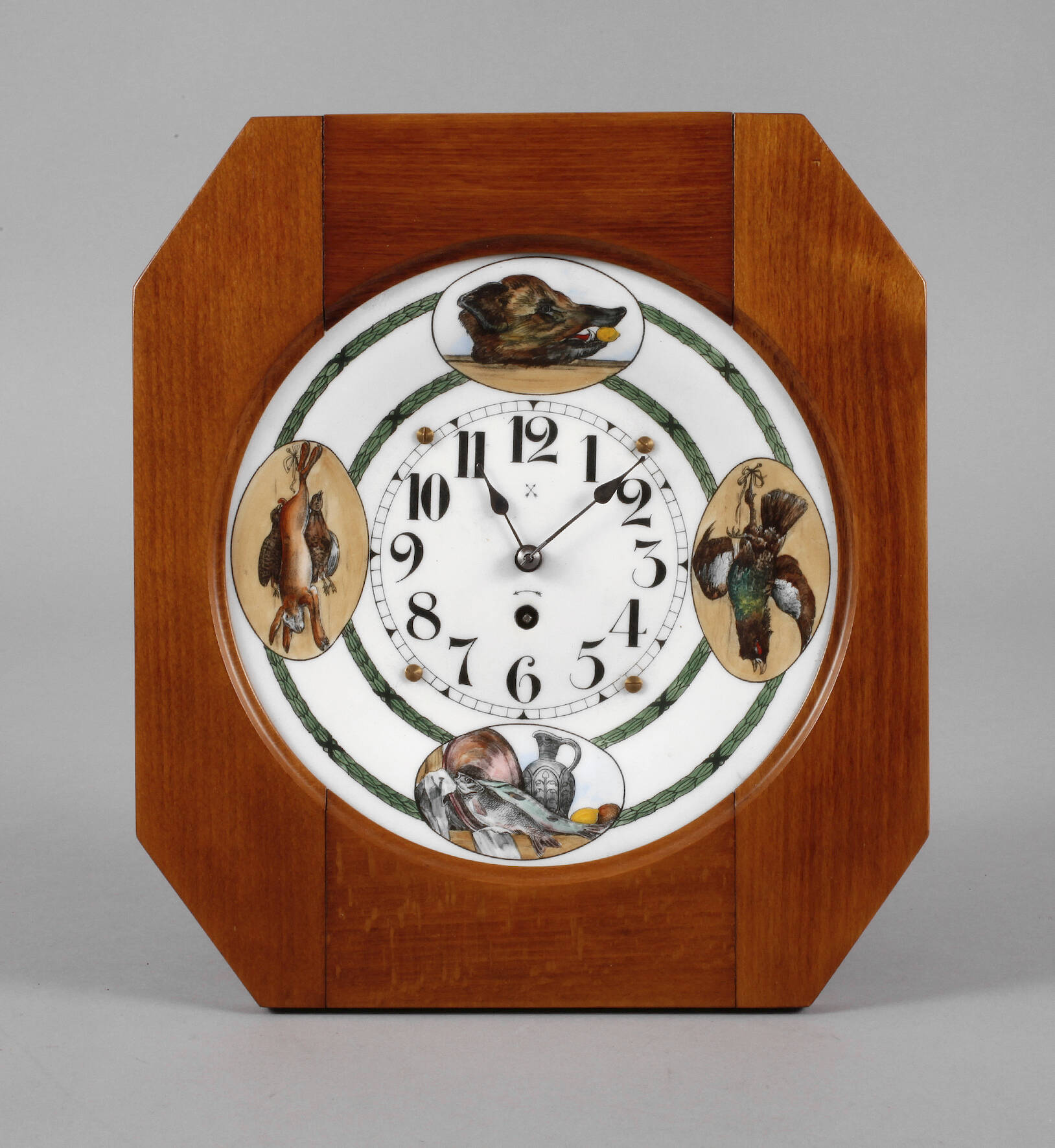deutsch, um 1900, Ziffernblatt und Werk mit Pfeilkreuzmarke, Gehäuse aus massiver Buche, gemuldetes Ziffernblatt mit farbig emaillierten Darstellungen von Wildtieren, Werk läuft, Abdeckung des Uhrwerks ergänzt, H 30 cm.
