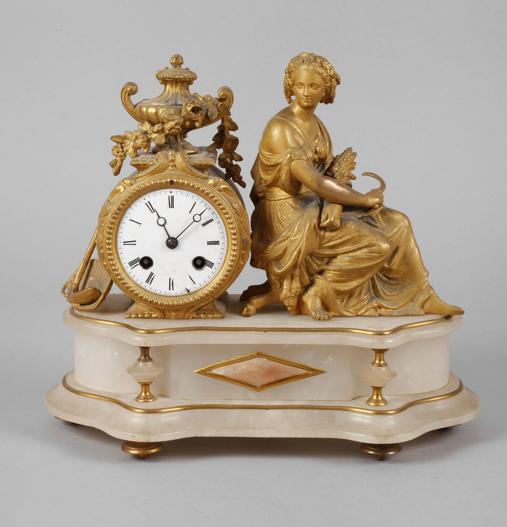 Frankreich, um 1860, rückseitig signiert, Metallguss vergoldet, Sockel aus Alabaster, Pendulenwerk mit Halbstundenschlag auf Glocke, emailliertes Ziffernblatt mit römischen Ziffern, dieses leicht beschädigt, sonst funktionstüchtig, mit Schlüssel, H 29 cm.