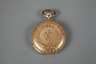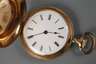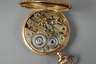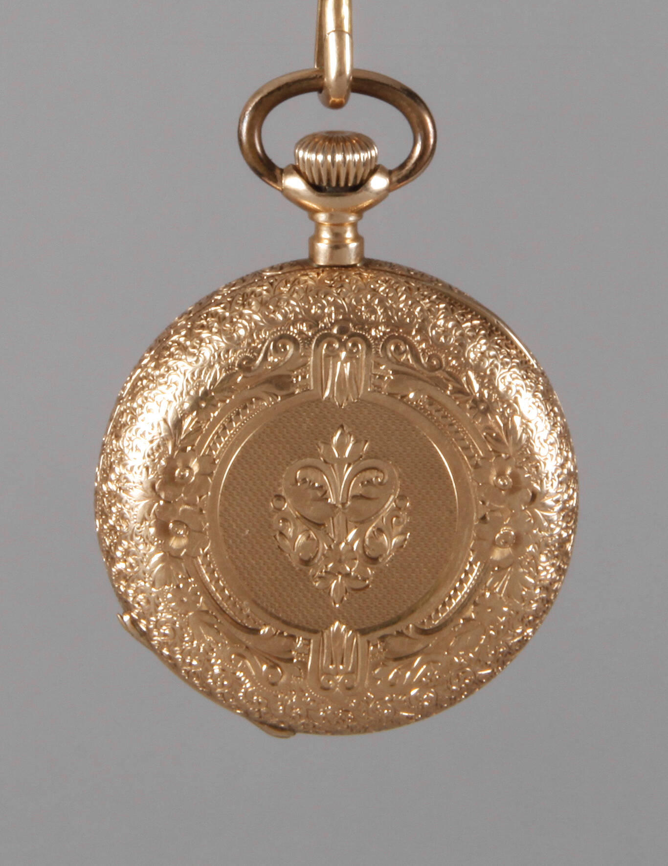 um 1900, Dreideckel-Goldgehäuse gestempelt 14 kt, makelloses Emailziffernblatt mit römischen Ziffern, Zylinderwerk, funktionstüchtig, an langer Doublékette, D 33 mm, G ohne Kette 31 g.