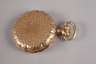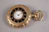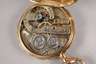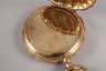 um 1890, Dreideckel-Goldgehäuse gestempelt 14 kt, dekoratives Gehäuse in Muschelform mit graviertem Dekor und außen liegendem, schwarz emailliertem Ziffernring, makelloses Emailziffernblatt mit römischen Zahlen und kleiner Sekunde, Werk mit Ankergang und großer Kompensations-Unruh mit Feinregulierung, funktionstüchtig, im originalen Etui der Firma Andreas Huber München, Z 1, D 47 mm, G 87 g.