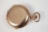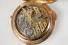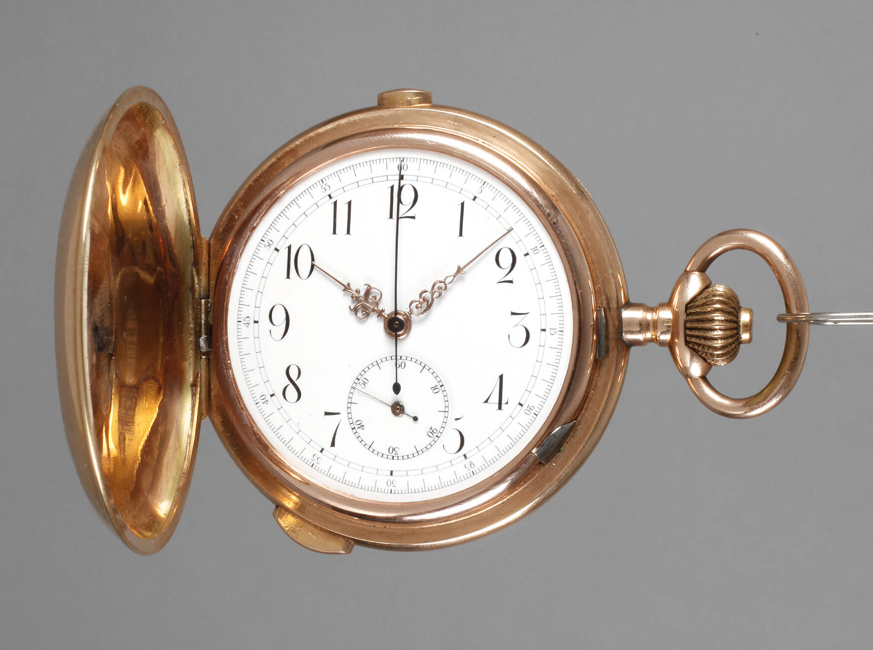 Schweiz, um 1900, guillochiertes schweres Dreideckel-Goldgehäuse, gestempelt 585, mit Medaillen verzierter Staubdeckel, verglastes feines Werk mit Ankergang, Chronograph und Viertelstunden-Repetition auf zwei Tonfedern, Auslösung über Drücker, makelloses Emailziffernblatt mit arabischen Ziffern und kleiner Sekunde, Chronograph mit Skala in 1/5 Sekunden-Teilung, funktionstüchtig, Z 2, D 60 mm, G 132 g.