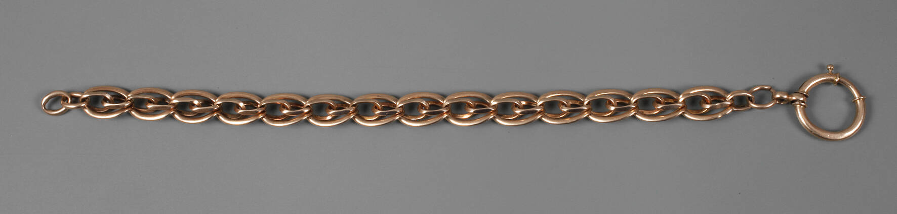 um 1910, Gelbgold gestempelt 585, bis zu 11 mm breite Glieder, L ca. 26 cm, G ca. 36,1 g.