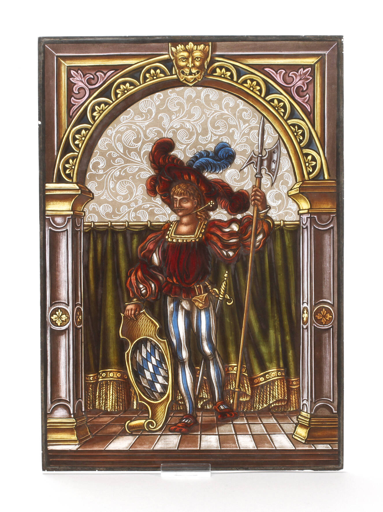 um 1890, fein gemalte figürliche Darstellung im Renaissancestil, Landsknecht mit bayerischem Wappenschild, H 36 x B 25 cm.