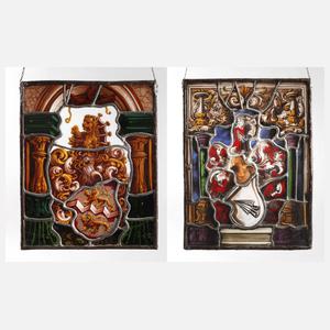 um 1890, fein gemalte Wappendarstellung im Renaissancestil, an Kette gehängt, guter Zustand, H 29,5 x 24 cm und H 31 x B 24 cm.
