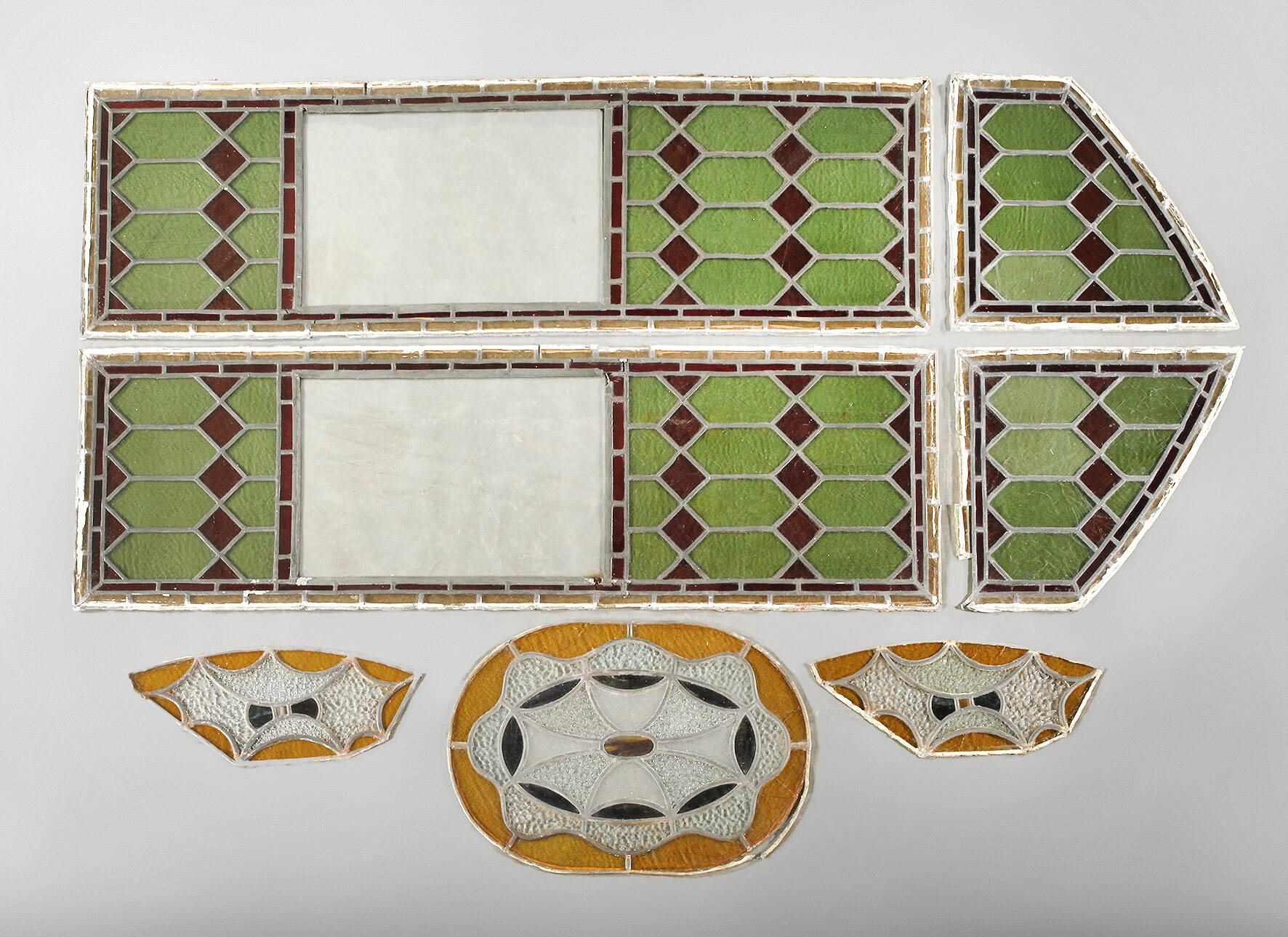 um 1900, Farb- und Ornamentglas mit geometrischem Dekor, bestehend aus zwei hochrechteckigen Scheiben und Oberlicht, dazu ein ovales Ornament und zwei Teile zur Ersatzteilgewinnung, H 160 x B 40 cm sowie H 50 x B 34 cm.