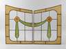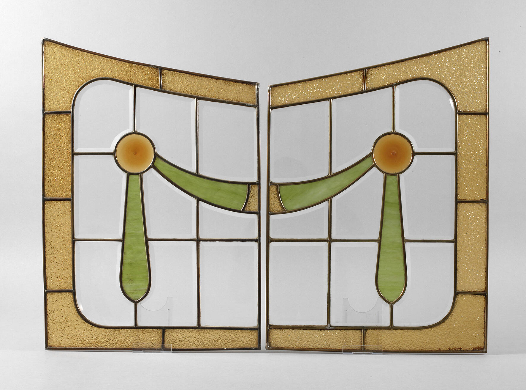 um 1900, zweiteilig, wohl Verglasung eines Möbels, in Messing gefasste facettgeschliffene Scheiben aus Klarglas, Feston aus mundgeblasenen Butzen und marmoriertem Farbglas, sehr guter Zustand, je 60 x 42 cm.
