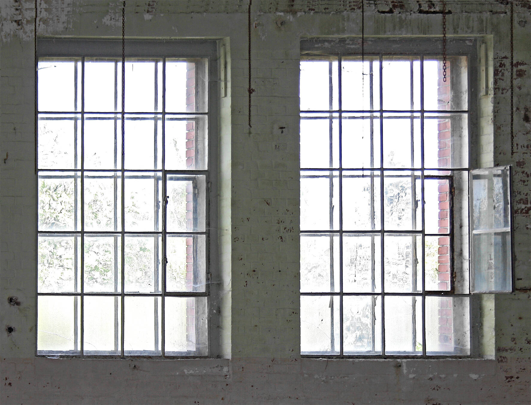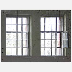 um 1900, große rechteckige Fenster aus Profileisen, jeweils mit einem Drehflügel, ausgebaut, teils alt verglast, Reste alter Farbfassung, Korrosionsspuren, B ca. 1,64 m, H ca. 2,60 m.