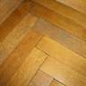 um 1920, 24 m², Format 7,5 x 50 x 2,5 cm, Fischgrätmuster, gepflegter Boden, lackiert, entnagelt und entfedert, auf eine Europalette gepackt.