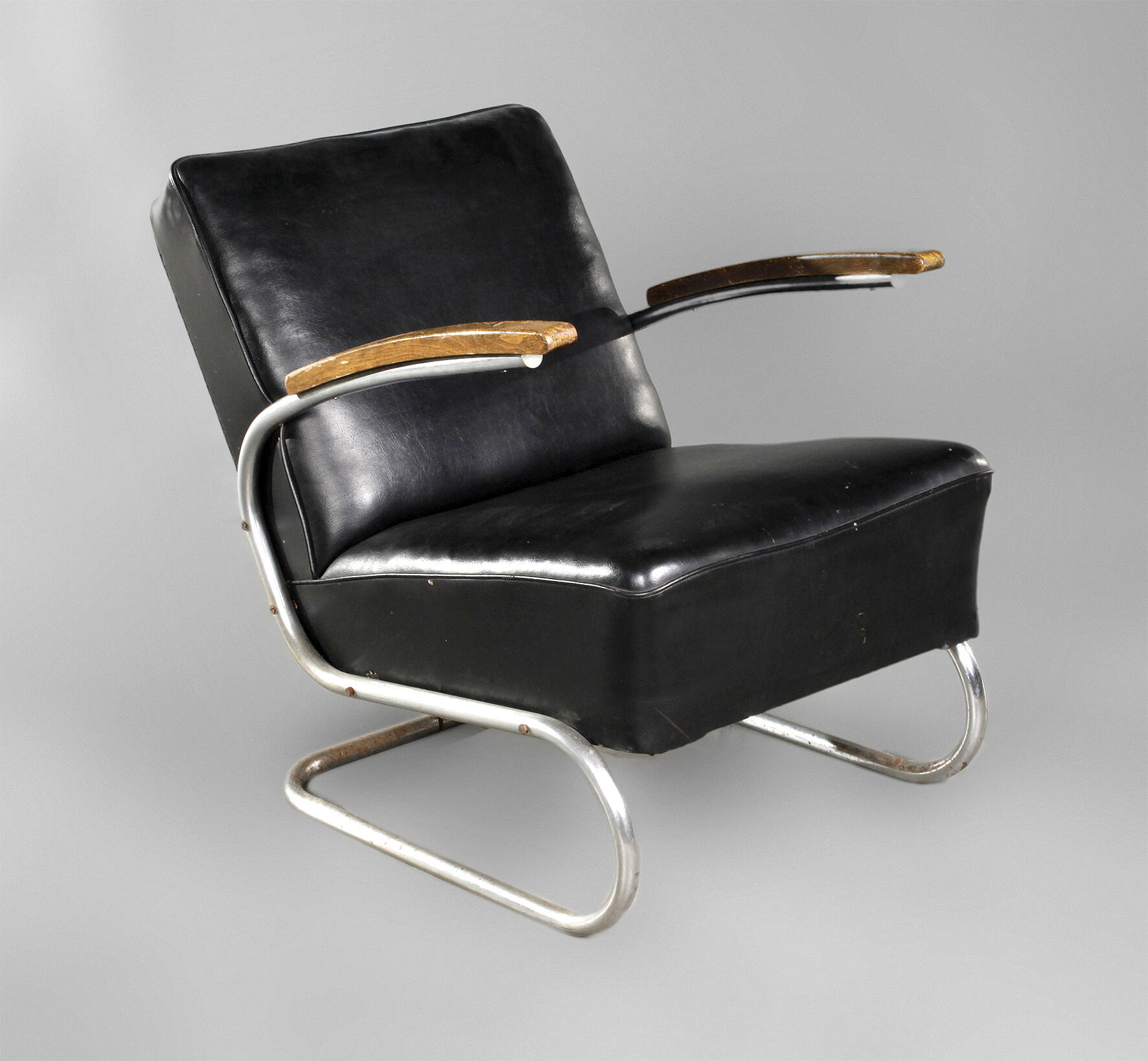 Modell S 411, Tschechien 1930er Jahre, schwingendes Stahlrohrgestell, Armauflagen aus Buche, originaler schwarzer Kunstledebezug, rückseitig mit Einriss, Chrom Z 2-, Maße 57 x 55 x 90 cm.