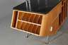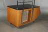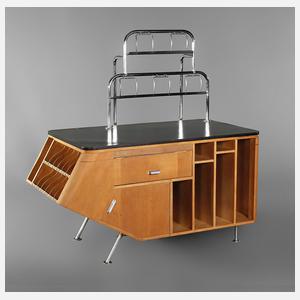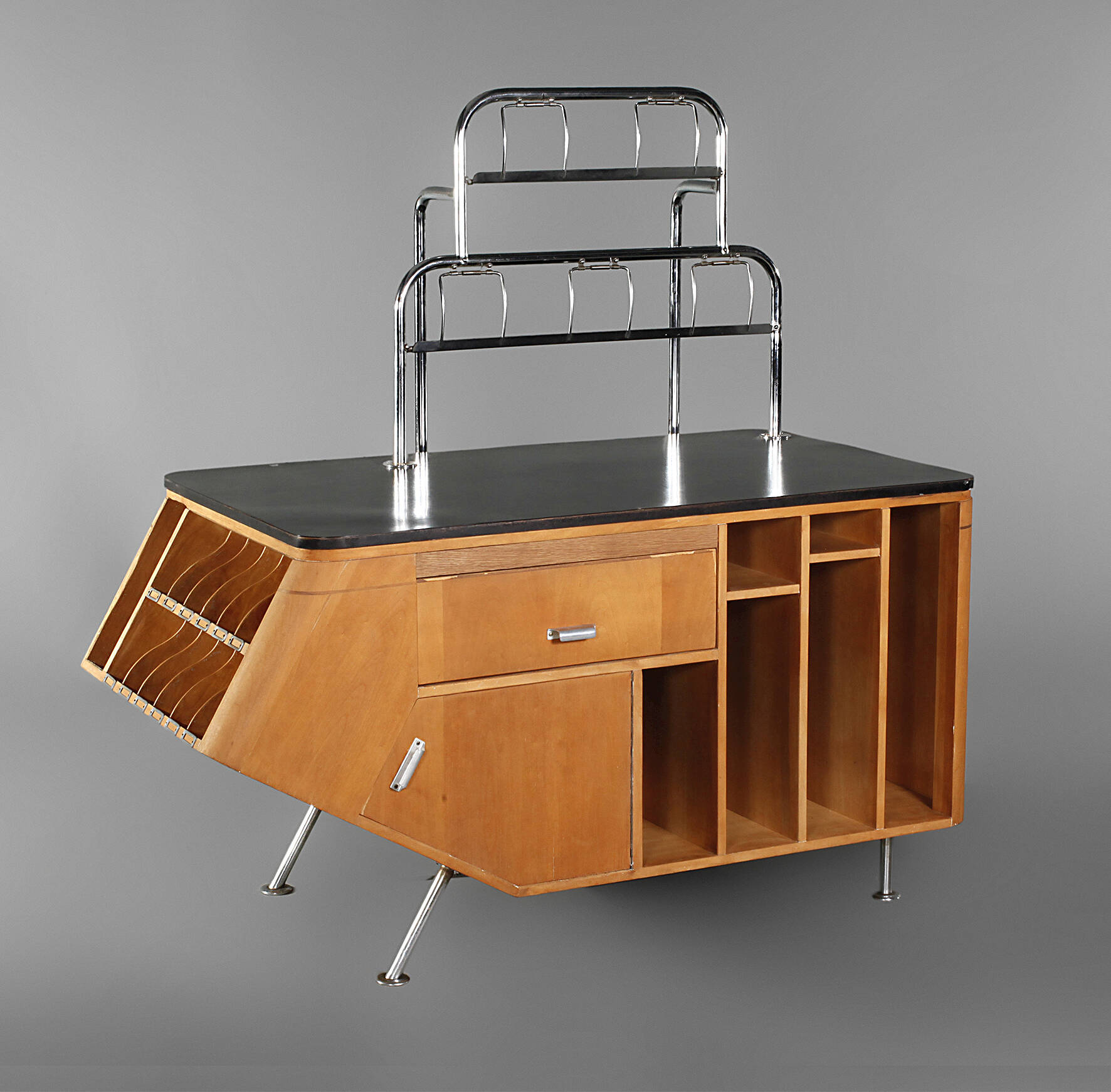 1960er Jahre, Korpus aus Buchenschichtholz, frei im Raum stellbarer asymmetrischer Korpus, mit zwei Papierrollenhaltern aus verchromtem Stahlrohr, die Platte geschwärzt, Beschläge aus Aluminium, Alters- und Gebrauchsspuren, Chrom Z 1-2, Maße 148 x 150 x 74 cm.