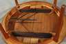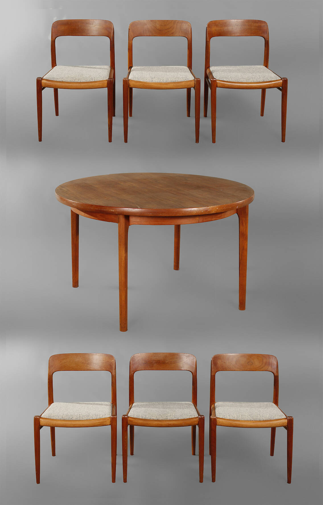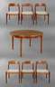 ungemarkt, bestehend aus rundem Auszugstisch und sechs Stühlen, dazu zwei separate Einlegeplatten, Stühle aus braun gebeiztem Massivholz mit Stoffpolster, guter Zustand, Maße Tisch H 73 cm, D 122 cm, L max. 224 cm.