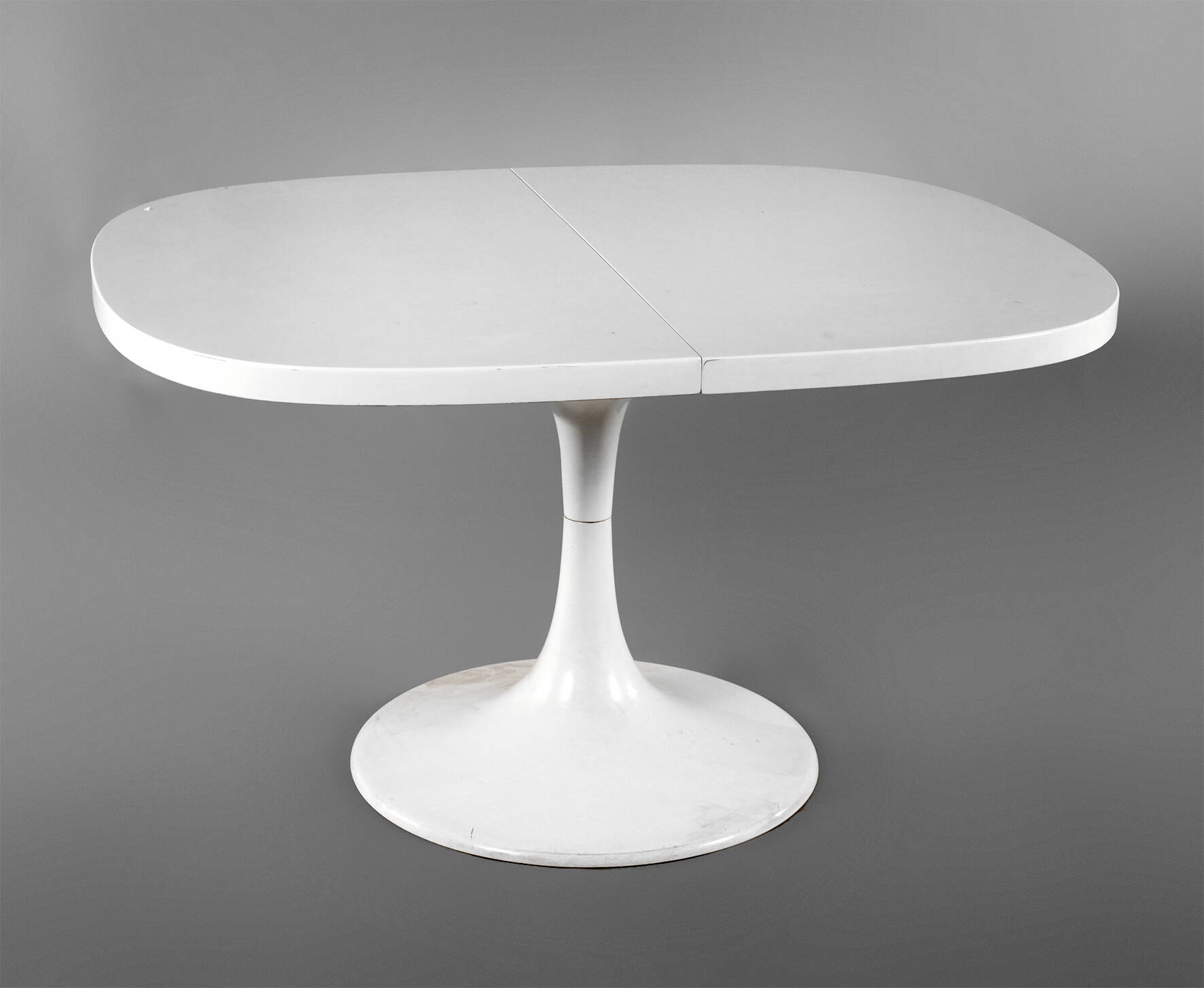 Entwurf Konrad Schäfer, 1970er Jahre, für Lübke Deutschland, ovaler Ausziehtisch mit integrierten Platten, original weiß lackiert, funktionstüchtig, Fuß aus geschäumtem Kunststoff, normale Gebrauchsspuren, Maße 72 x 125 x 106 cm, L max. 173 cm.