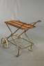 1950er Jahre, messingfarbenes Gestell, mit gummibereiften Rädern, abnehmbares Holztablett und Bastgriffe, normale Altersspuren, Maße 75 x 80 x 41 cm.