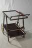 Italien 1970er Jahre, Mahagoni massiv und furniert, Räder aus massivem Messing mit Gummibereifung, eingelassene Glasplatte, im unteren Teil Flaschenhalter, guter Originalzustand, Maße 74 x 76 x 46 cm.