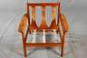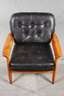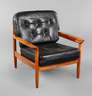 wohl 1960er Jahre, Gestell aus Kirsche und Buche massiv, Sitzkissen aus schwarzem Leder, im Rücken dreiteilige gebogene Verstrebung aus Schichtholz, normale Gebrauchsspuren, Maße 83x79x83 cm.
