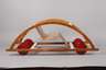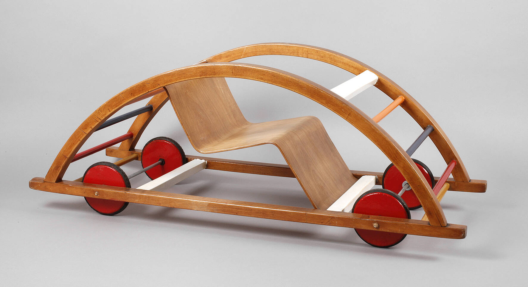 Entwurf Hans Brockhage und Erwin Andrä um 1950 (unter Leitung von Mart Stam im Seminar für Spielzeug an der Hochschule für Bildende Künste, Dresden), Hersteller Siegfried Lenz (Berggießhübel bei Pirna), ungem., Buchenholz und Schichtholz klar lackiert, gummibereifte Scheibenräder, die Querstäbe später farbig gefasst, sonst guter Zustand, Maße 40 x 38 x 104 cm.