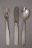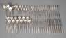 1950er Jahre, gestempelt WMF Patent 45, Alpacca versilbert, 90er Silberauflage, bestehend aus sieben Messern, acht Gabeln, zwölf Speiselöffeln, fünf Fischgabeln, sechs Fischmessern, sieben Kuchengabeln, acht Kaffeelöffeln und sechs Vorlegeteilen, Gebrauchsspuren, L Kelle 29 cm.