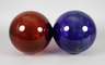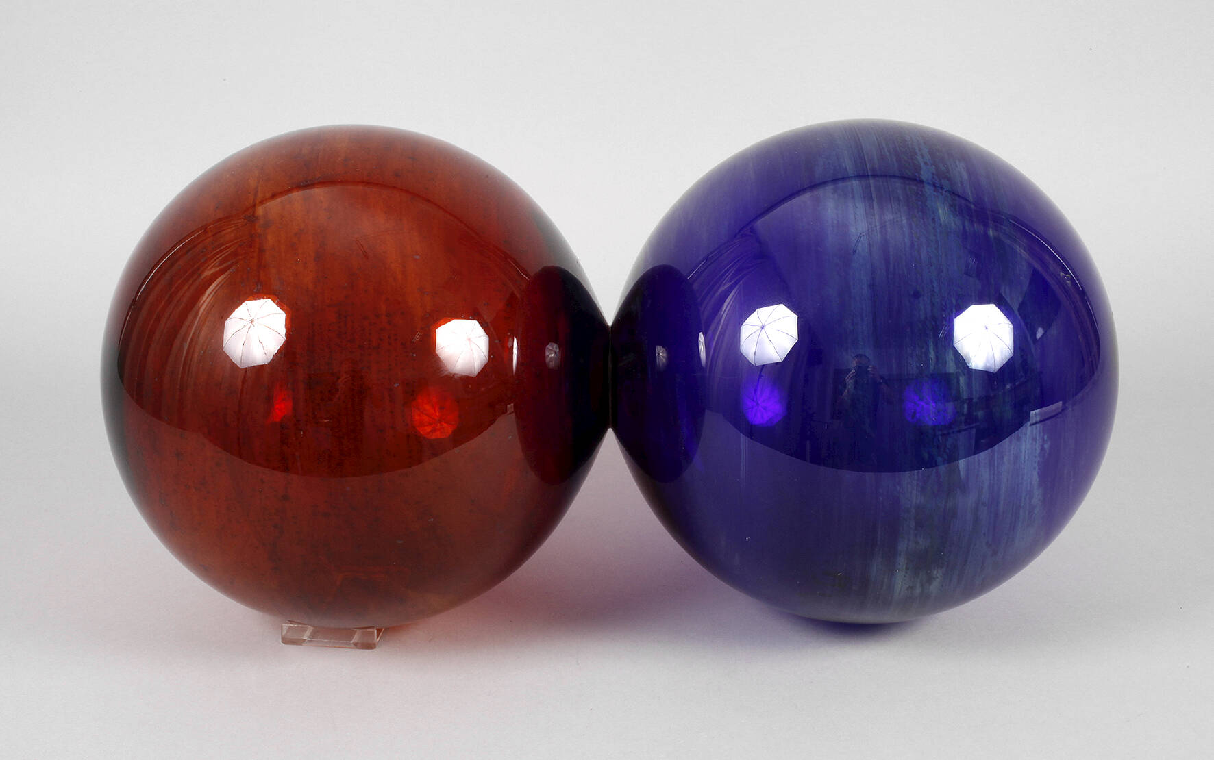 signiert und datiert (19)65, kobaltblaues und braungesprenkeltes Glas, zwei Kugeln miteinander montiert, dazu zwei Aufstellringe aus Messing, unbeschädigt, L 56 cm.