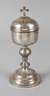 wohl Mitte 18. Jh., versilbert, innen vergoldet, verziert mit gravierten Palmetten und Früchten sowie Ornamentbändern, Deckel bekrönt von einem Kreuz, Versilberung teilweise verputzt, H 25 cm.