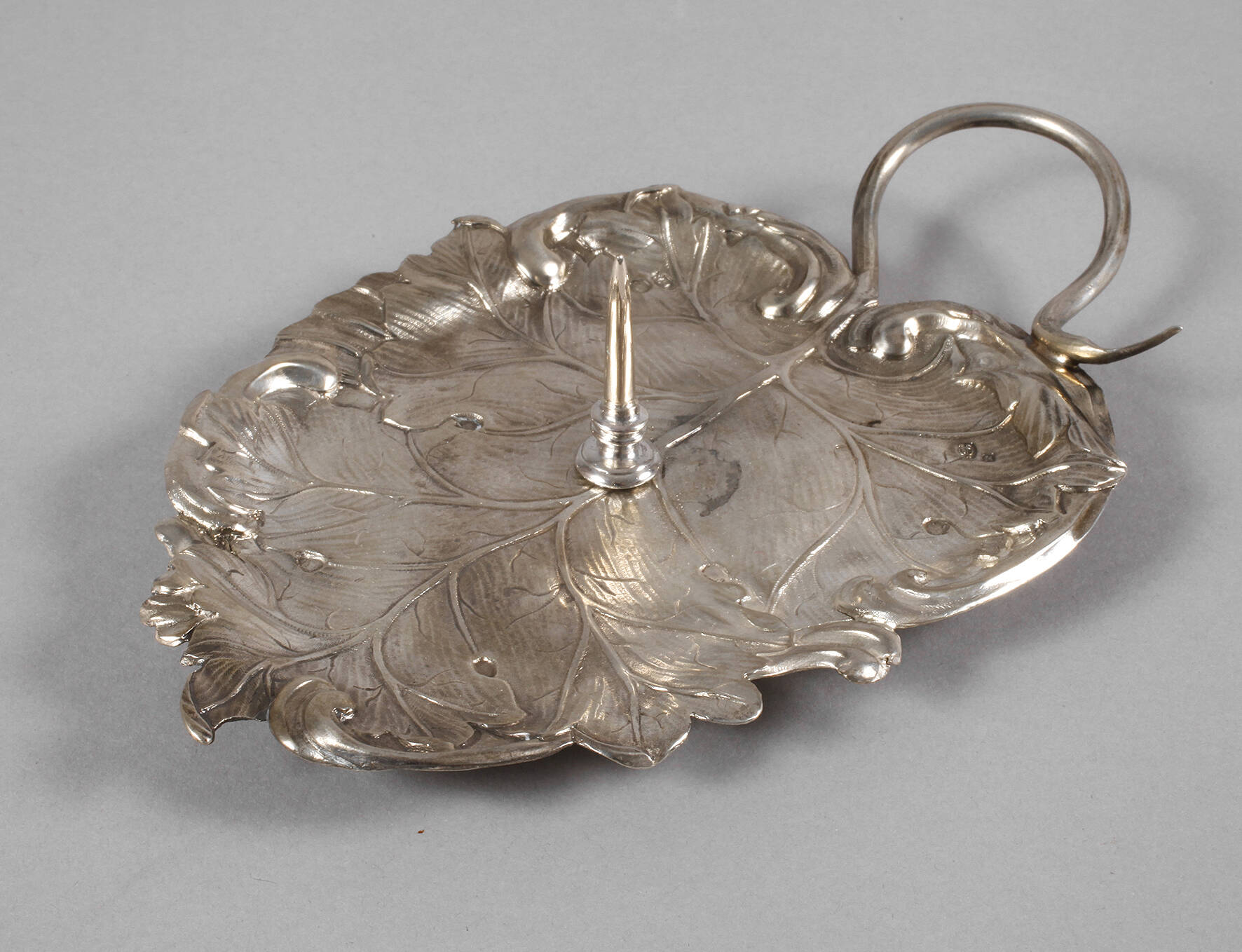 datiert 1817, Silberstempel 13 Lot, weitere Punzen VR und CB, fein getrieben und ziseliert, als Blatt mit Griff und Docht, sehr schöner Originalzustand, L 19,5 cm, G ca. 119 g.
