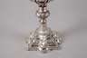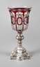 um 1860, gestempelt 13 Lot, der Fuß fein getrieben und verziert mit floralen Elementen, graviert und ziseliert, ausgegossen, die glockenförmige Kuppa aus farblosem Glas, rubinrot überfangen, Schäl- und Kerbschliffornamentik, guter altersgemäßer Zustand, H 23 cm.
