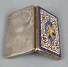 Ende 19. Jh., Silber gestempelt 800, innen vergoldet, scharnierter Klappdeckel, fein graviert und emailliert, von Rollwerk und Ornamentbändern gerahmte Katusche mit geflügeltem Löwen, ein Buch mit lateinischer Aufschrift haltend, Unterseite etwas gedellt, Emaille gut erhalten, L 7,5 cm, G ca. 54 g.
