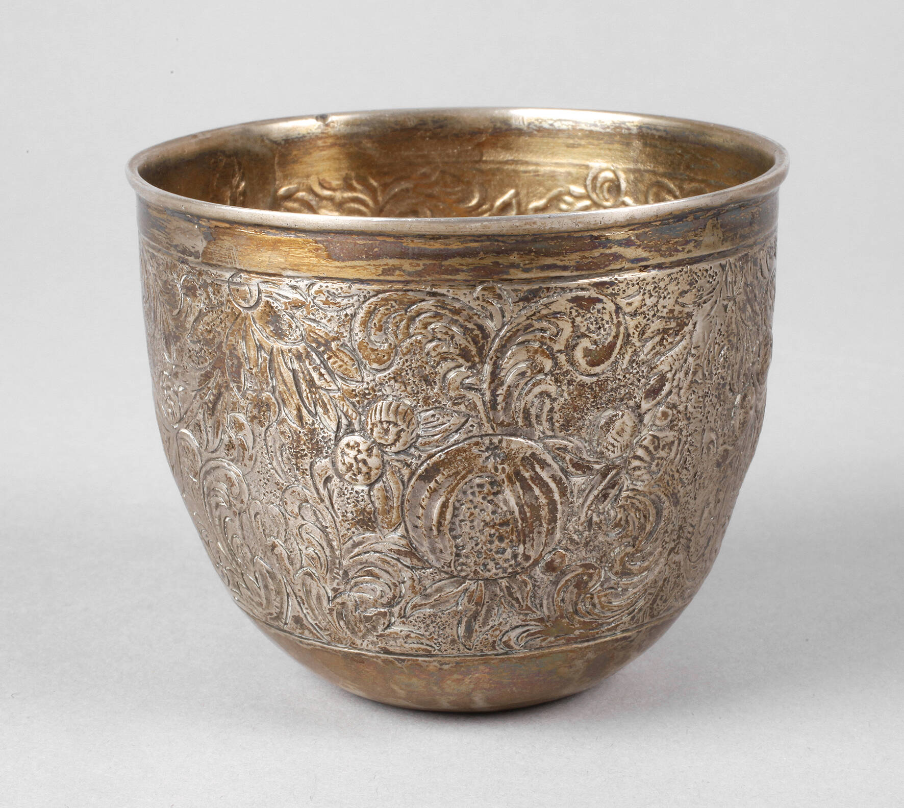 Hanau, 19. Jh., Prägemarke und Meisterstempel "A" im Wappen mit Krone, Silber geprüft, innen vergoldet, in barocker Art mit reliefierten Früchtemotiven, die Oberfläche ziseliert, geringe Altersspuren, H 7 cm, G ca. 156 g.