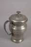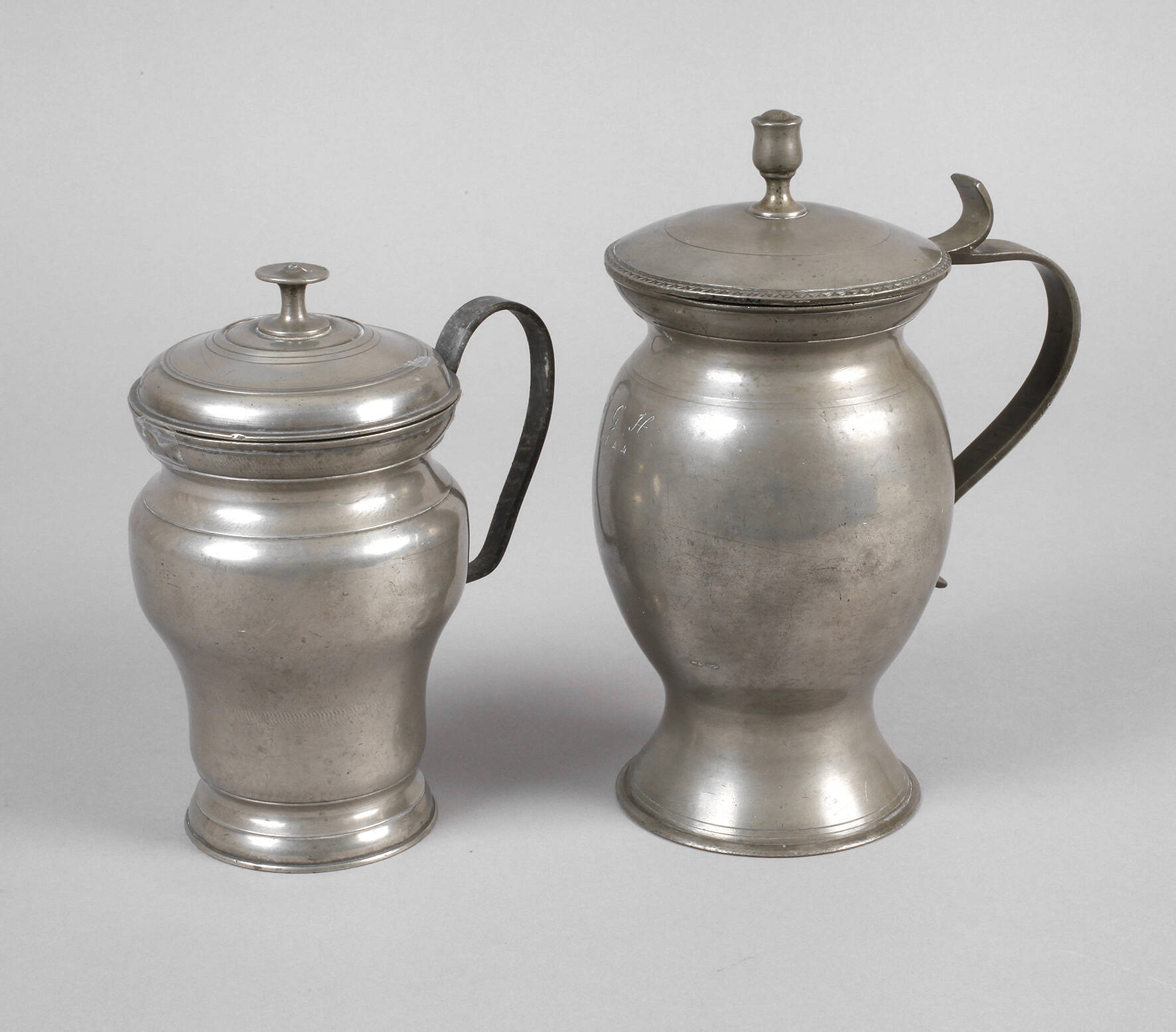 eins gepunzt Johann Friedrich Herold in Hof/Saale, Meister ab 1840, das andere mit ungedeuteter Marke, Zinn gegossen, verziert mit Rillendekor und Ornamentband, eins mit Besitzermonogramm JGH 1844, eine Bastwicklung am Henkel fehlt, H 17 und 22 cm.