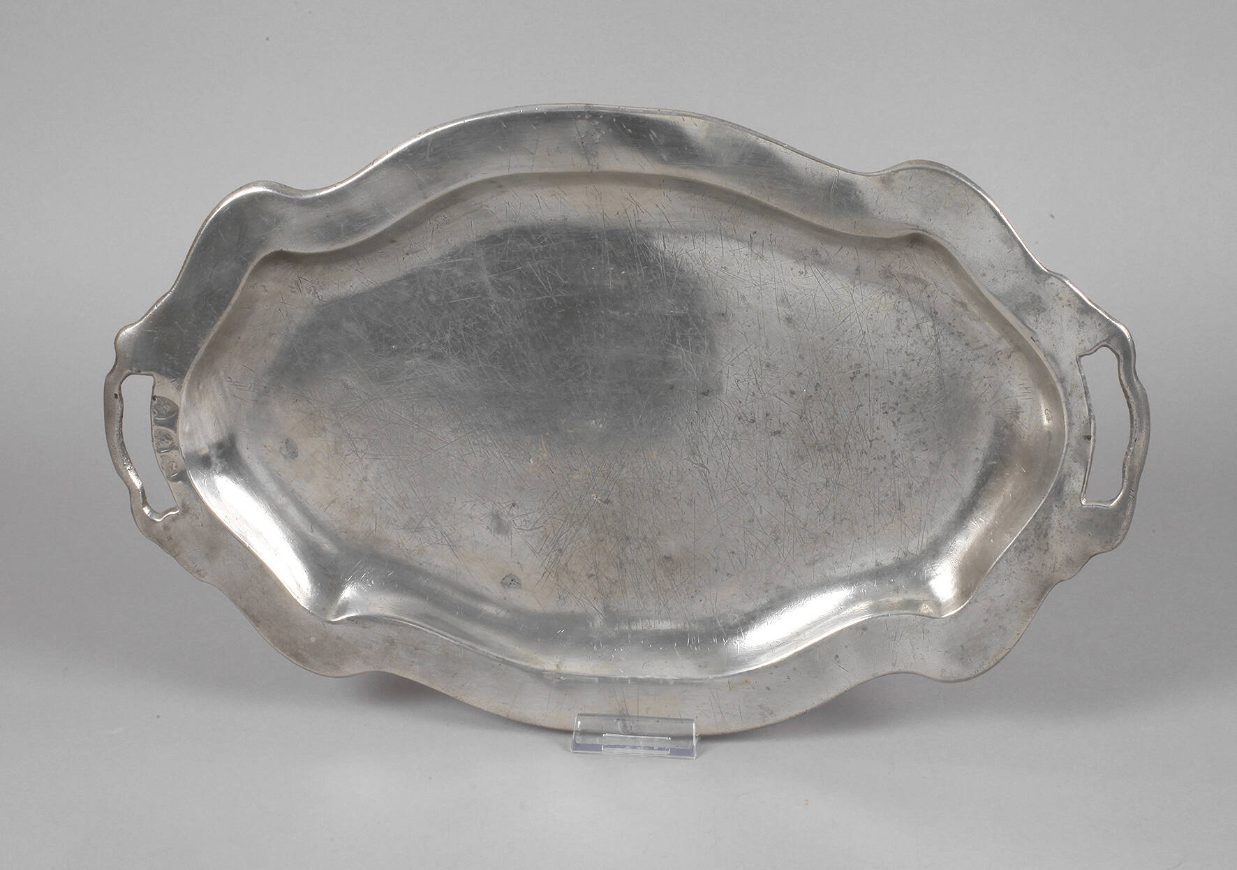 gepunzt "Carl Gotthelf Hermersdörfer Zwickau", Meister ab 1826, schwere geschweifte Schale mit durchbrochenem Griff, stärkere Gebrauchsspuren, ein gleiches Stück im Plauener Museum, L 48 cm.