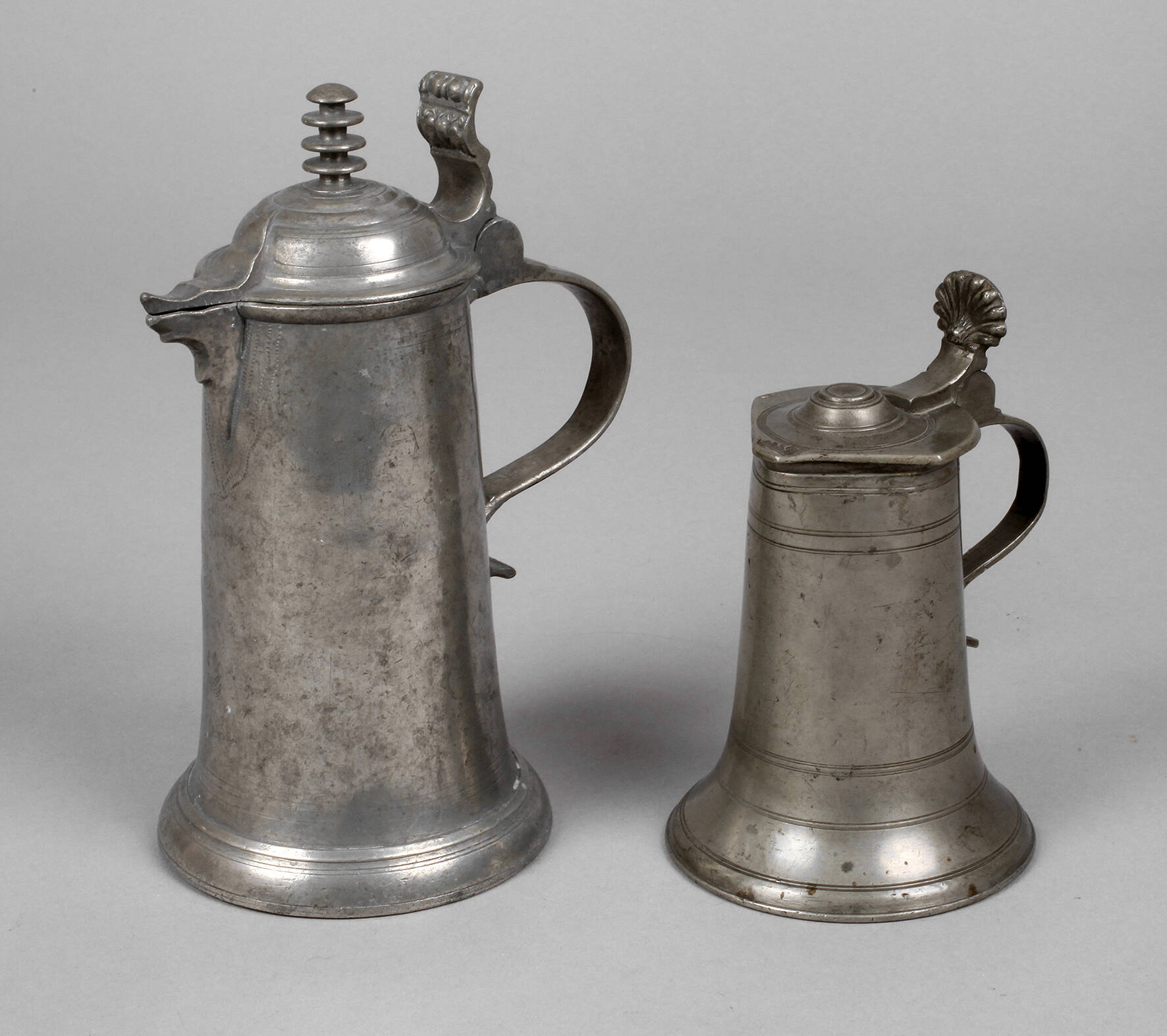 Esslingen, 2. Hälfte 18. Jh., die größere gepunzt Johann Andreas Martin, heiratete 1752, starb 1783, Schnabelstitze mit Profilringen und Scheibenknauf, das kleinere Kännchen wohl Joseph Deyber (1733–1793), verschlagene Punze an der Schnaupe, Muscheldrücker, innen Eichzapfen, normale Gebrauchs- und Altersspuren, H 13 cm und 19 cm.