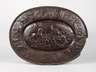 um 1880, gegossen und braun patiniert, im Spiegel Szenerie Trojanisches Pferd, auf der Fahne allegorische und kriegerische Darstellungen, dazwischen Engelsmotive, seitlich eine größere Beschädigung (Rand fehlt), Unterkante der Fahne stärker korrodiert, H 56 x B 75 cm.