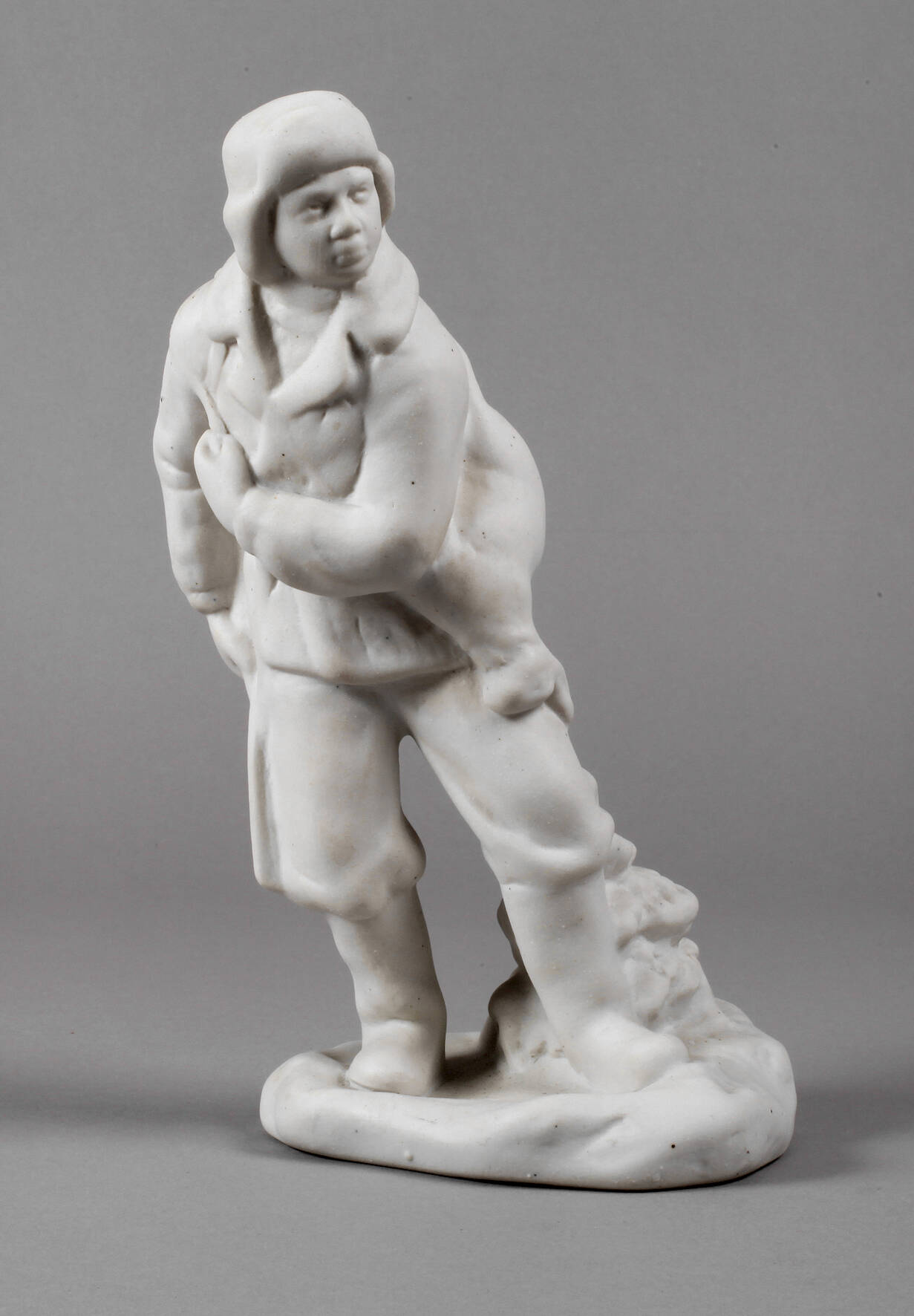 Firma Dmitrov in Werbilky bei Moskau, 1950er Jahre, ungemarkt, Biskuitporzellan unglasiert, Jäger in Winterkleidung, mit Hase, auf einem naturalistischen Sockel stehend, etwas brandfleckig, sonst unbeschädigt, H 23,5 cm.