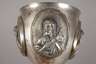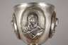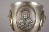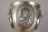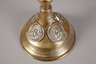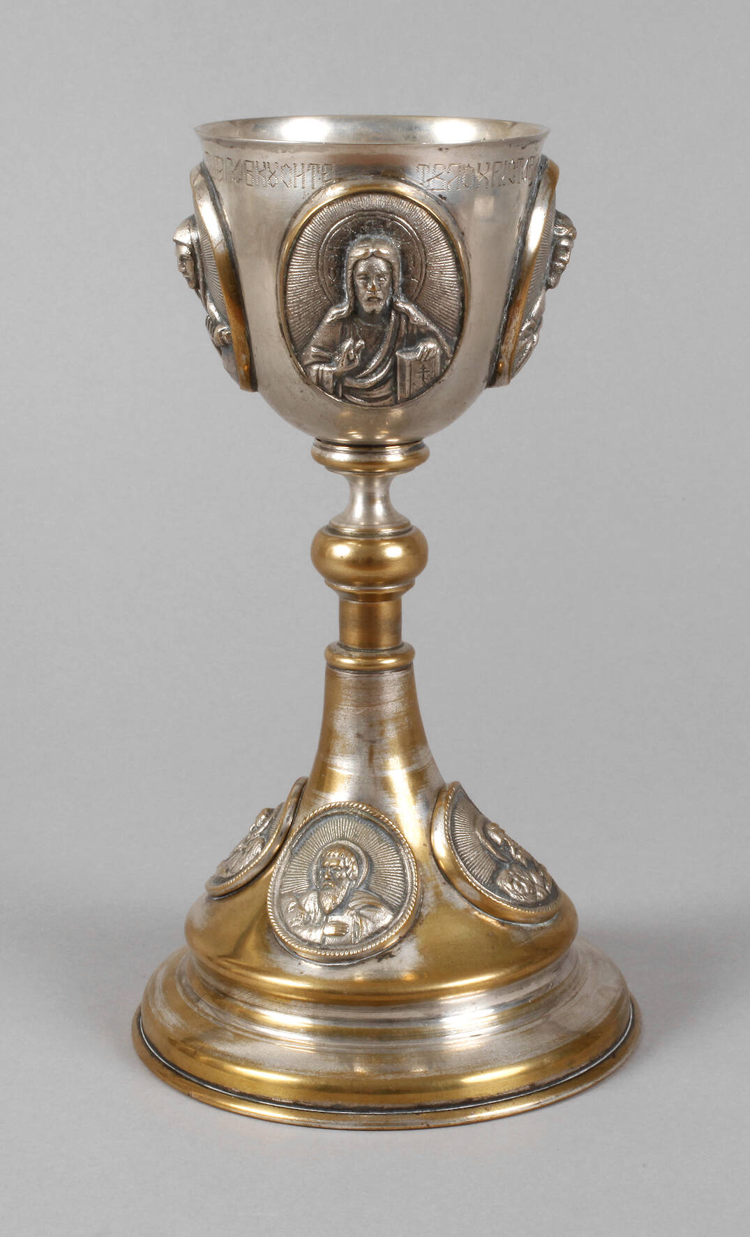 19. Jh., Messing mit Resten alter Versilberung, aufgelegte Bronzemedaillons mit Heiligenfiguren, kyrillische Umschrift, Gebrauchsspuren, H 24 cm.