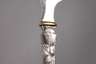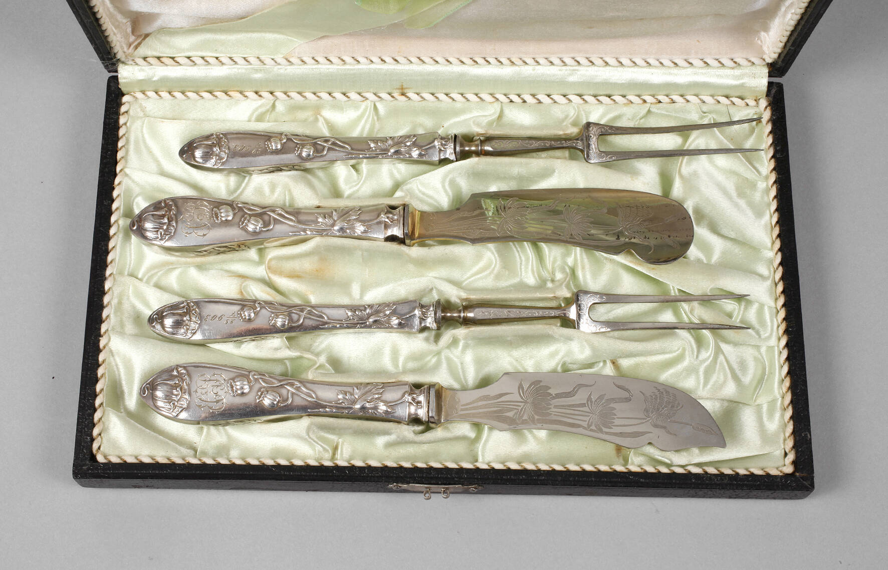 datiert 1903, Klingen Silber gestempelt 84 Zolotniki, reliefierter Mohnblütendekor mit Knospen, graviertes ligiertes Besitzermonogramm, geätzte Stahlklingen, Butter- und Käsemesser sowie zwei Wurstgabeln, etwas korrodiert, im originalen Kasten, G total ca. 185 g.