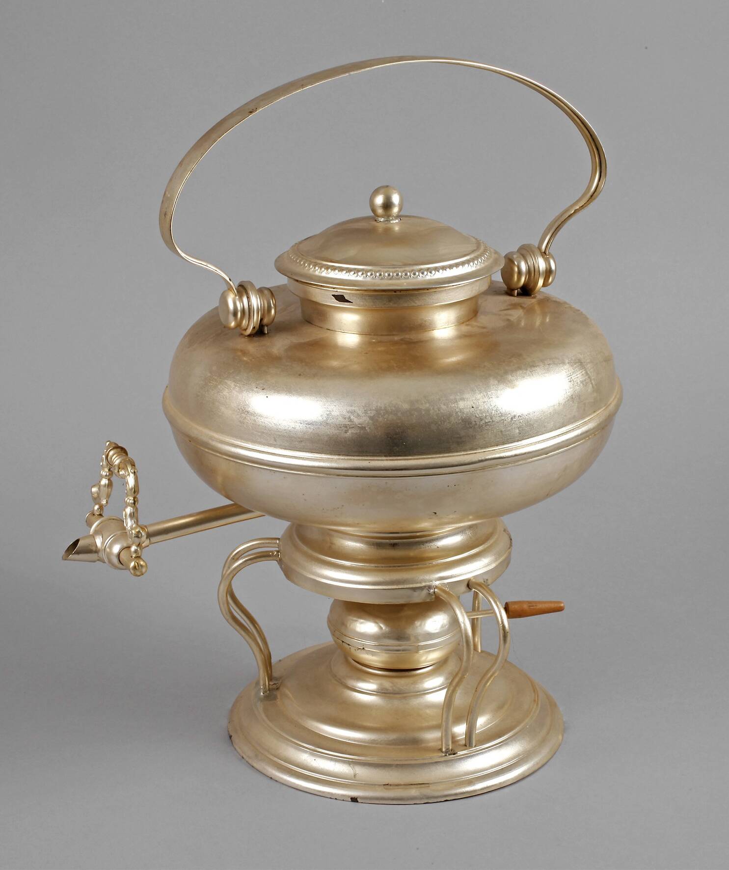 Anfang 20. Jh., ungewöhnlicher Samowar mit abnehmbarem, gedrücktem, gehenkeltem sowie innen verzinntem Wasserbehälter mit Deckel und dezent plastisch verziertem Ausgusshahn, passendem Stövchen und separatem Brenner, Kessel unterseitig sowie am Stövchen unterm Brenner je gemarkt mit gestempeltem Doppeladler sowie undeutlicher Nummer 20 oder Hersteller "RO", beiliegend Restaurierungsrechnung "Silberschmiede H.-P. Heck Plauen ... Samowar 3-teilig Kupfer/versilbert Rußland ..." von 1986 über Erneuerung der Versilberung, Holzgriff des Brenners neuzeitlich ergänzt, Gebrauchs- und Altersspuren, H 41 cm.