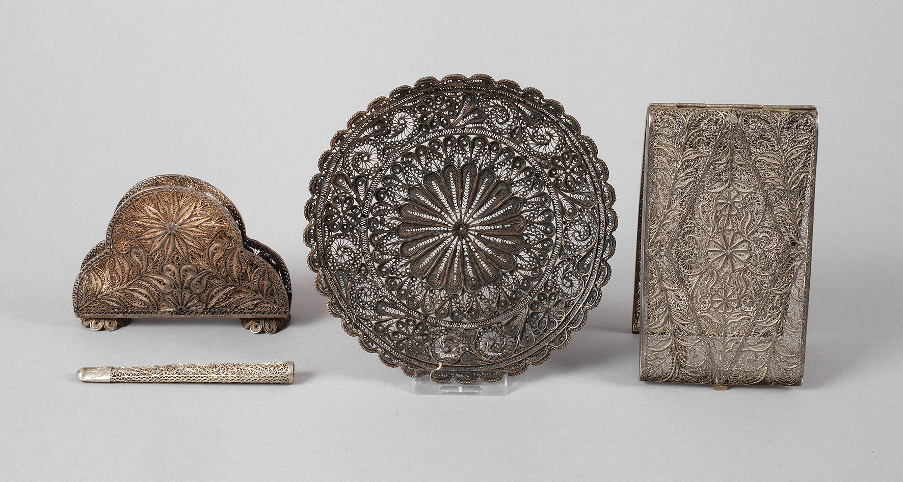 Mitte 20. Jh., ungestempelt, Silber geprüft, aus filigranen gekordelten Silberdrähten kunstvoll geflochten, Zigarettendose, Schälchen, Serviettenhalter und eine Zigarettenspitze, diese mit graviertem Besitzermonogramm "AA", D Schälchen 14 cm, G total ca. 395 g.