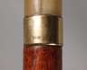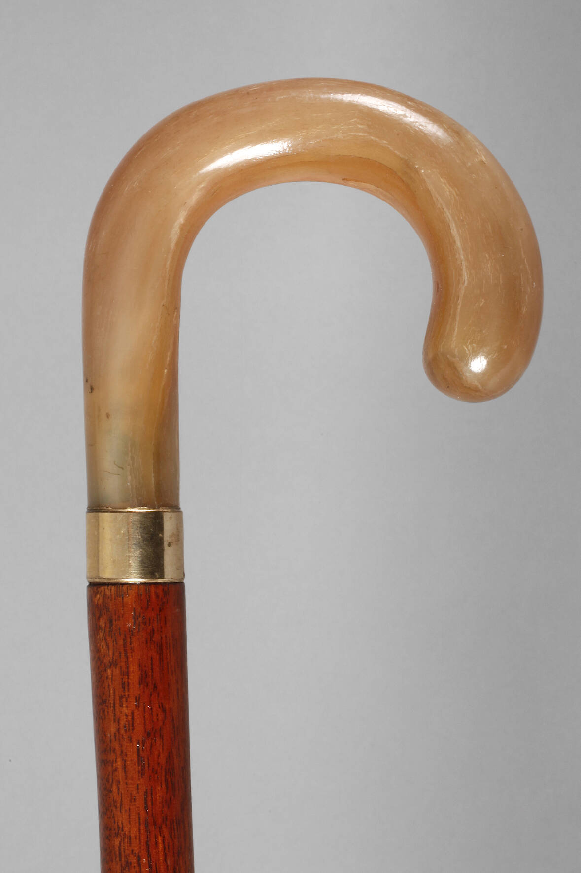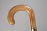 Frankreich Anfang 20. Jh., geschwungenes Griffstück aus Kunststoff in Hornoptik, vergoldete Metallmanschette, Hartholzschuss, Beinzwinge, Altersspuren, H 85 cm.