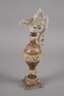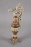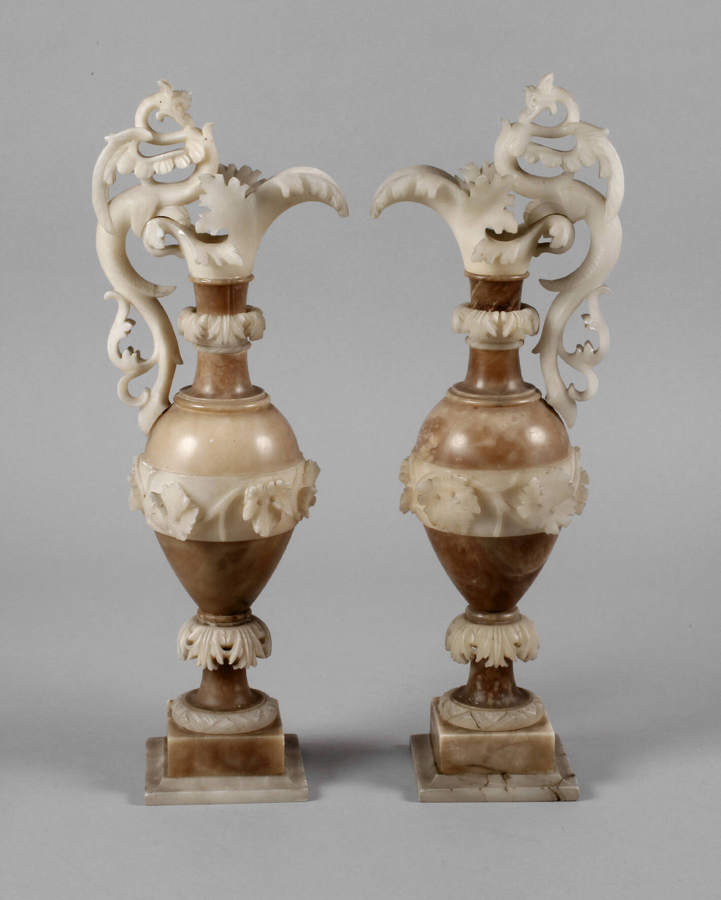 Ende 19. Jh., aus verschiedenfarbigem Alabaster gefertigt, über getrepptem Stand gebauchte Henkelkannen, mit reichem plastischen Weinblatt- und Volutendekor, partiell alt rep., min. best., H je 44 cm.