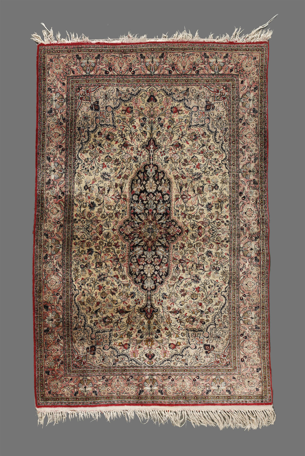 2. Hälfte 20. Jh., komplett durchmustertes Mittelfeld und zarte Bordüren in cremigem Kolorit, verkürzte Schmalseiten, Maße 153 x 100 cm.