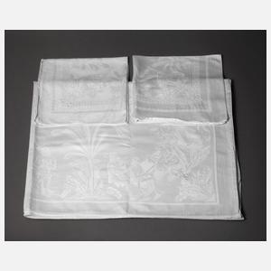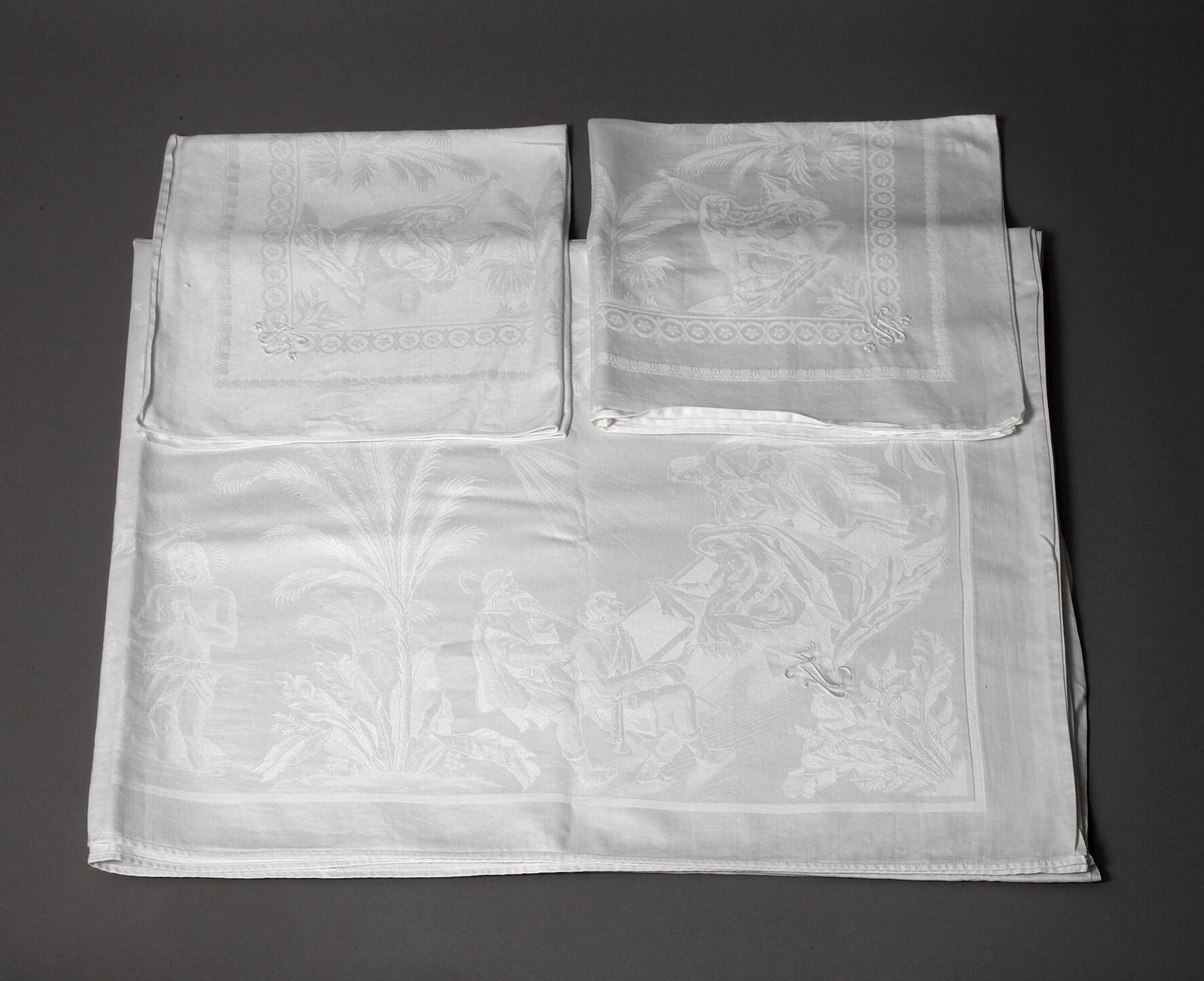um 1900, weißer Halbleinendamast mit eingewebter zentraler Abendmahlsszene, gerahmt von Ornamentbändern und christlichen Darstellungen im Bordürenbereich, gesticktes Monogramm JF, beigegeben zwei passende Servietten, Erhaltungsmängel, Maße 123 x 210 cm.