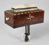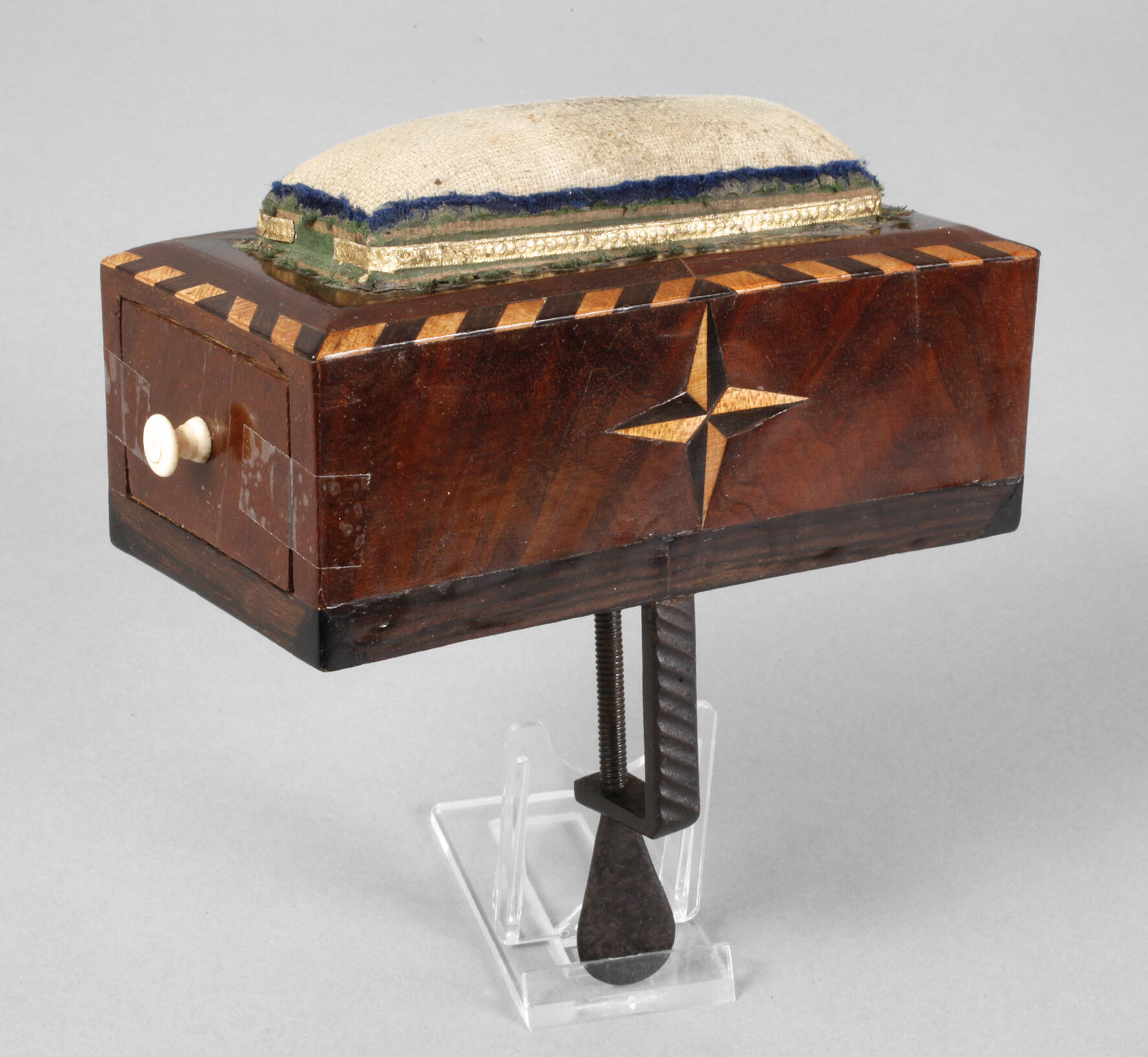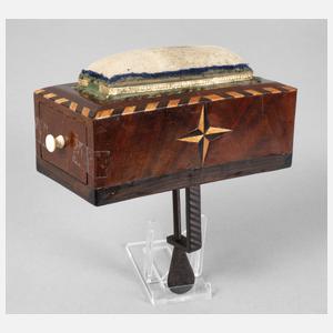 um 1820, aufwendig furniertes Gehäuse in Nussbaumwurzel, Ebenholz und Ahorn, langerechteckiges Kästchen mit kleinem Schub und Elfenbeinknauf, die Oberseite mit eingelassenem Nadelkissen, an der Unterseite geschwärzte Eisengussmontierung mit Rädelschraube zur Tischmontage, Altersspuren, Maße 15 x 8 x 8 cm.